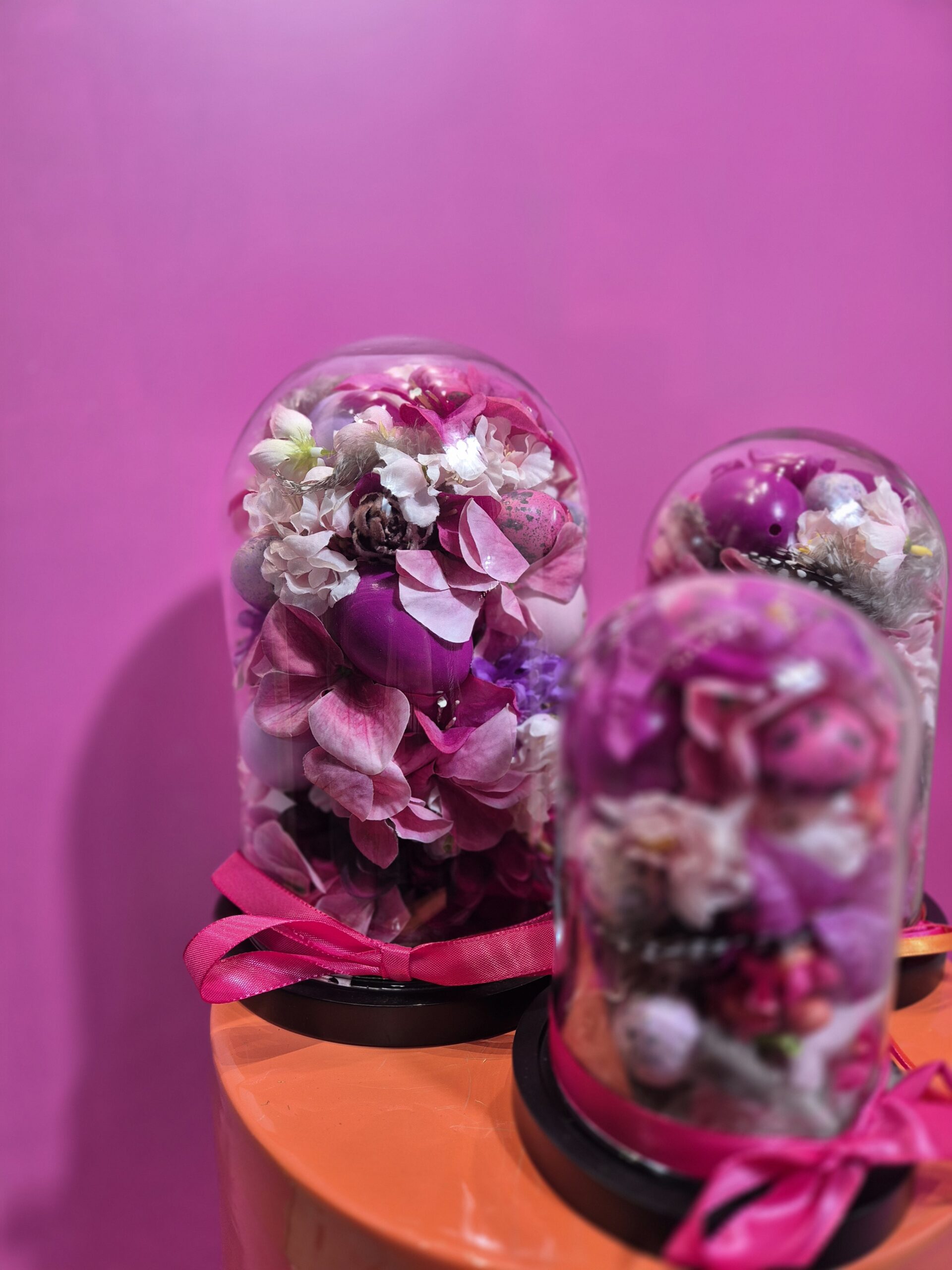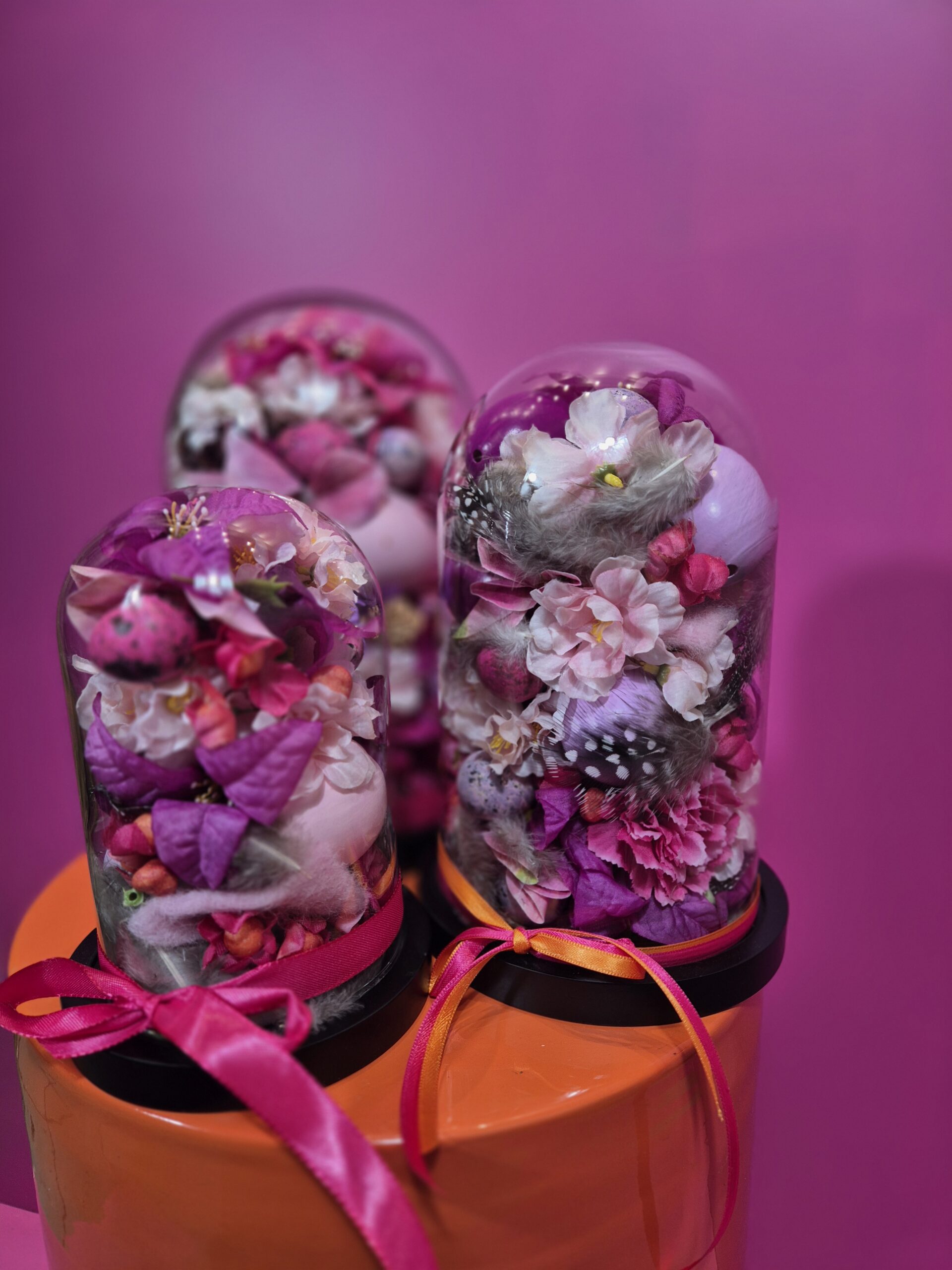 Deze te leuke bloemenstolpen zijn gevuld met zijdenbloemen en houdbare voorjaarsartikelen. Je kan ze dus voor altijd mooi houden 🙂