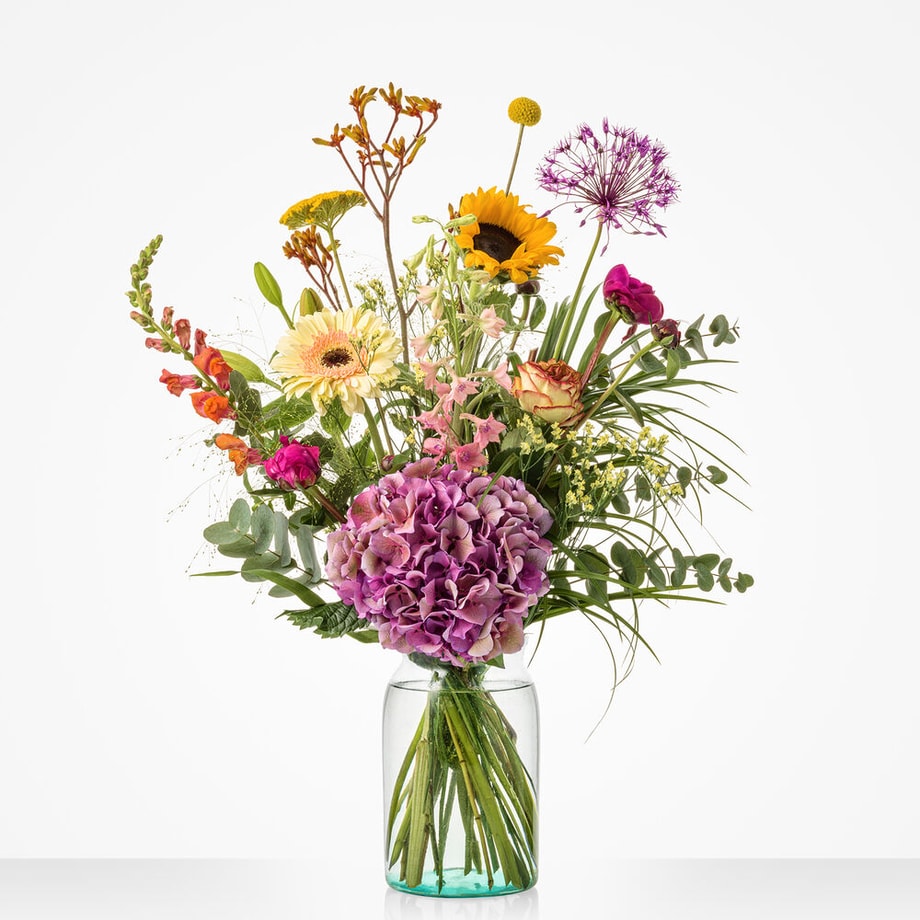 Het boeket kenmerkt zich door de opvallende hortensia, de vrolijke zonnebloem en de verfijnde allium. Het resultaat is een kleurrijk en speels boeket om de zomer goed mee te beginnen.