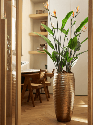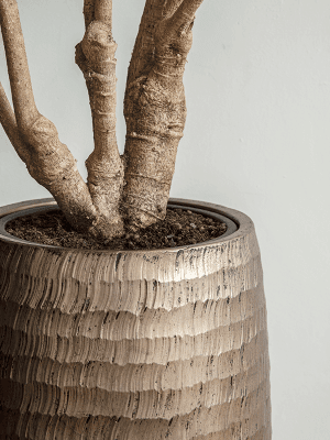 Deze plantenbak is vervaardigd uit polyresin, een stevig materiaal dat bestaat uit een mengsel van gemalen steen en hars. De plantenbak heeft een geribbeld oppervlak en een matte afwerking, wat bijdraagt aan een moderne uitstraling. Dit model is ontworpen voor gebruik binnenshuis. De plantenbak is voorzien van een binnenbak, waardoor het assembleren eenvoudig is en het onderhoud wordt vergemakkelijkt.