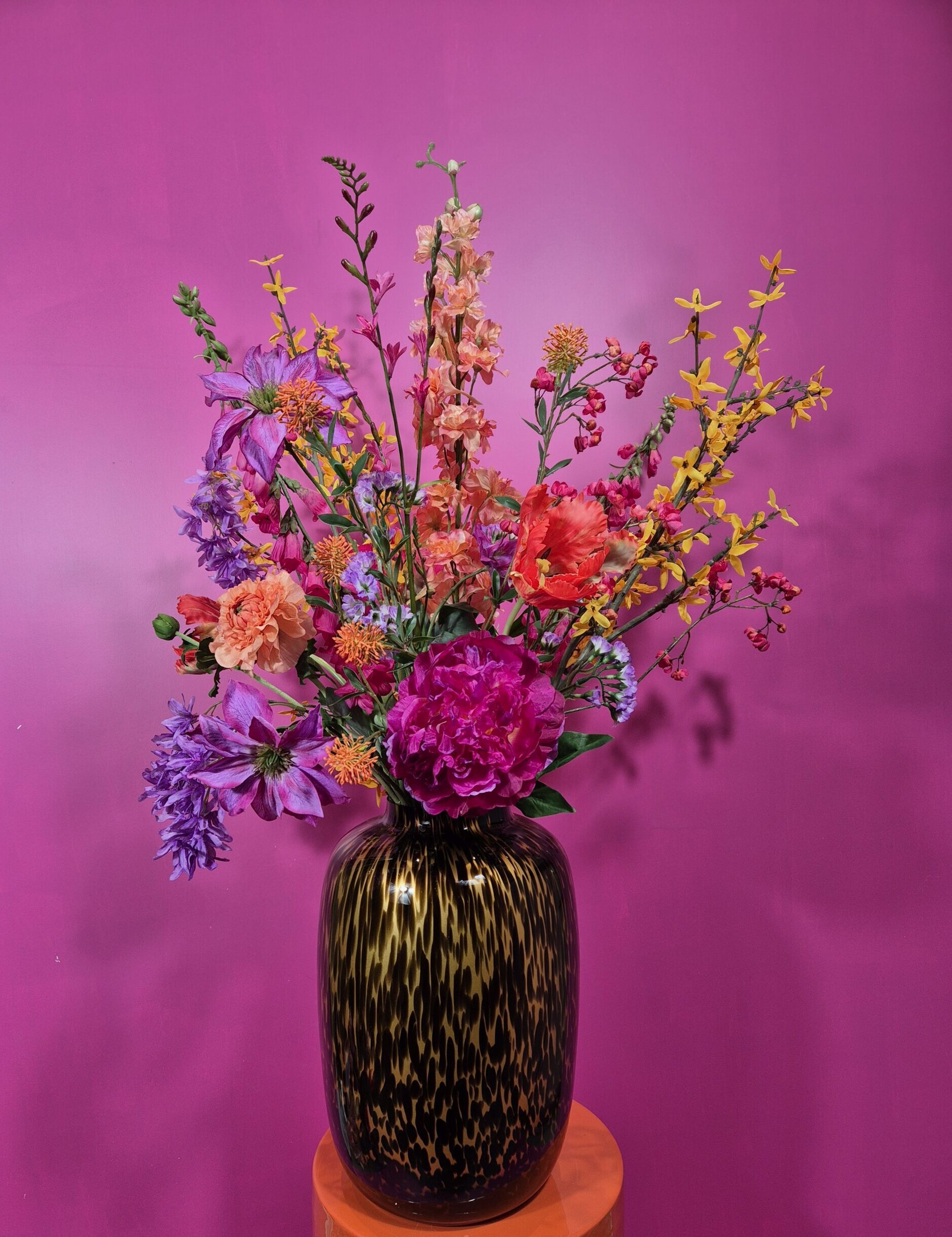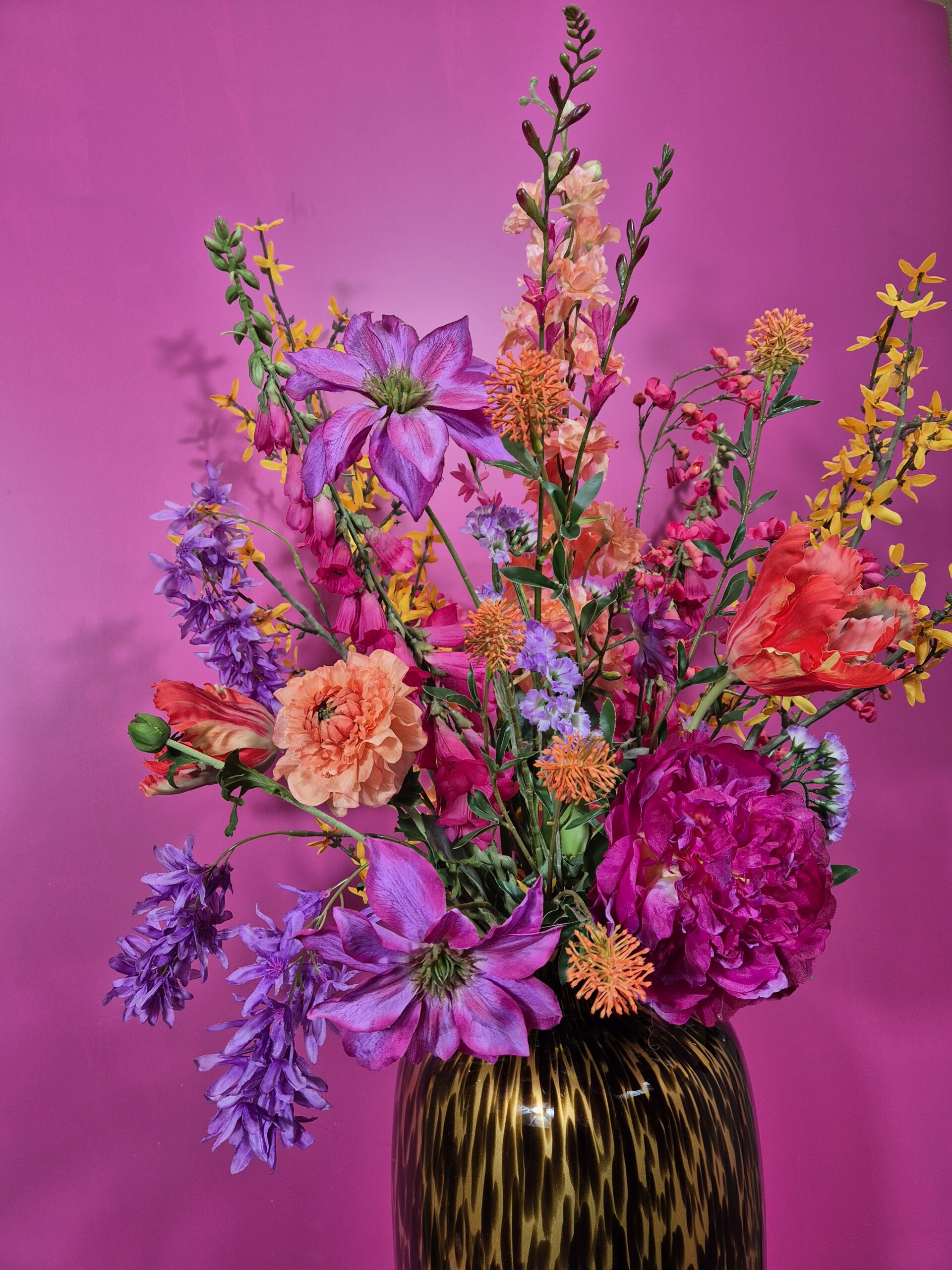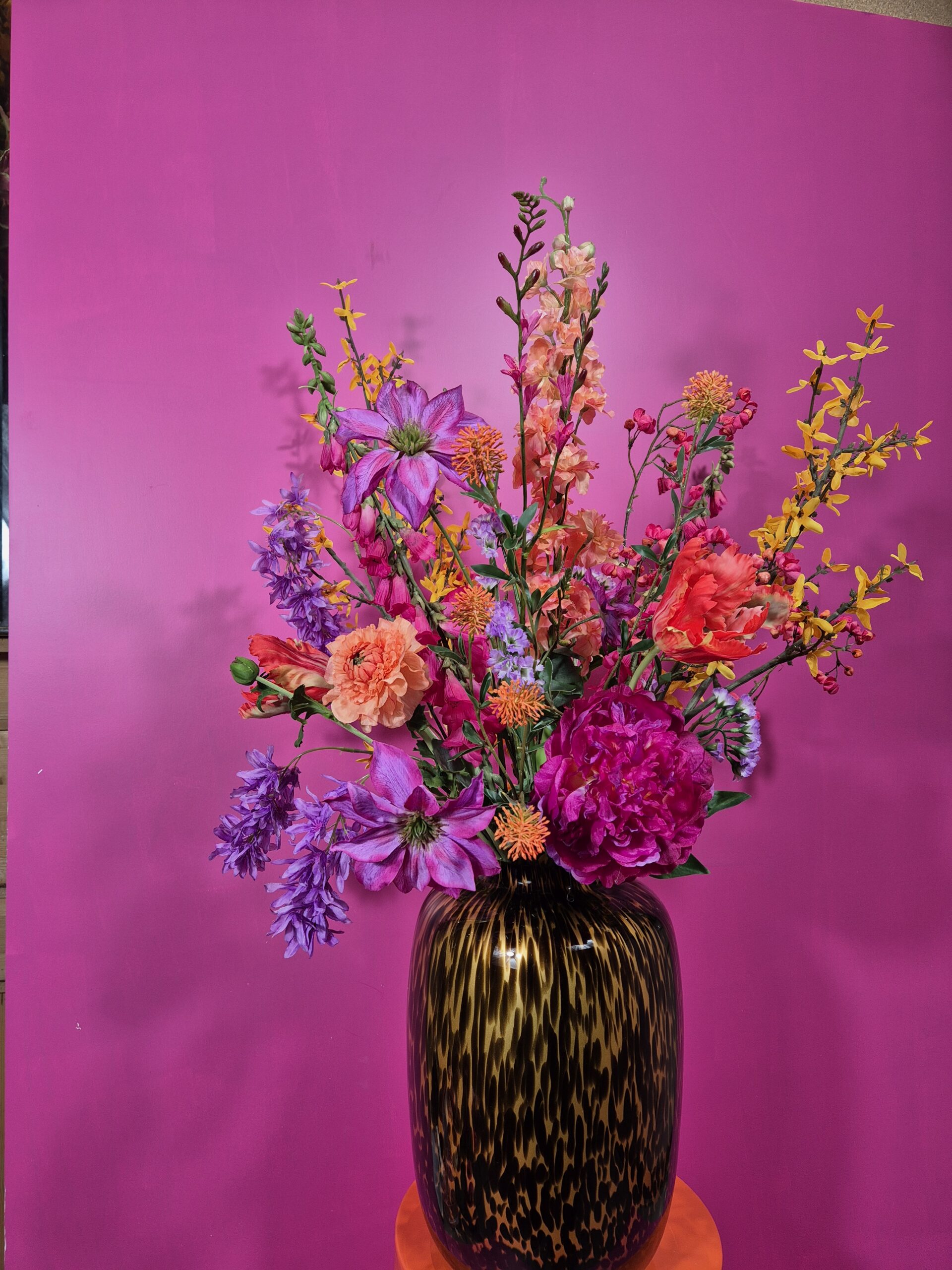 Dit expressieve zijdenboeket is een echte blikvanger vol kleur en karakter. De combinatie van fuchsia, paars, lila, geel en warme perziktonen geeft het boeket een speelse, bijna artistieke uitstraling. Door de variatie in bloemsoorten, hoogtes en texturen oogt het arrangement natuurlijk en dynamisch, alsof het zo uit een bloeiende tuin komt.
